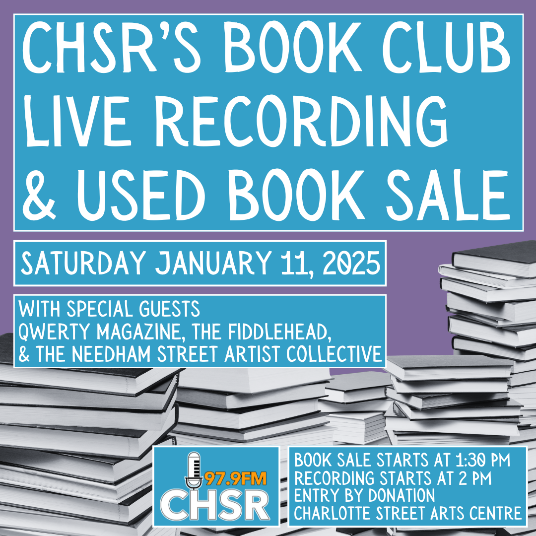 Join us on Saturday January 11 in the CSAC auditorium for a live recording of CHSR FM's Book Club and used book sale! Featuring special guest Qwerty Magazine, The Fiddlehead, and the Needham Artist Collective. Used book sale starts at 1:30 and live recording starts at 2 PM. For this special episode of Book Club, CHSR is inviting audience members to join our hosts to talk about their favourite books, author, genre, or what they're reading right now - please sign up in advance here: https://forms.gle/ovHX5CncRU63UUs37